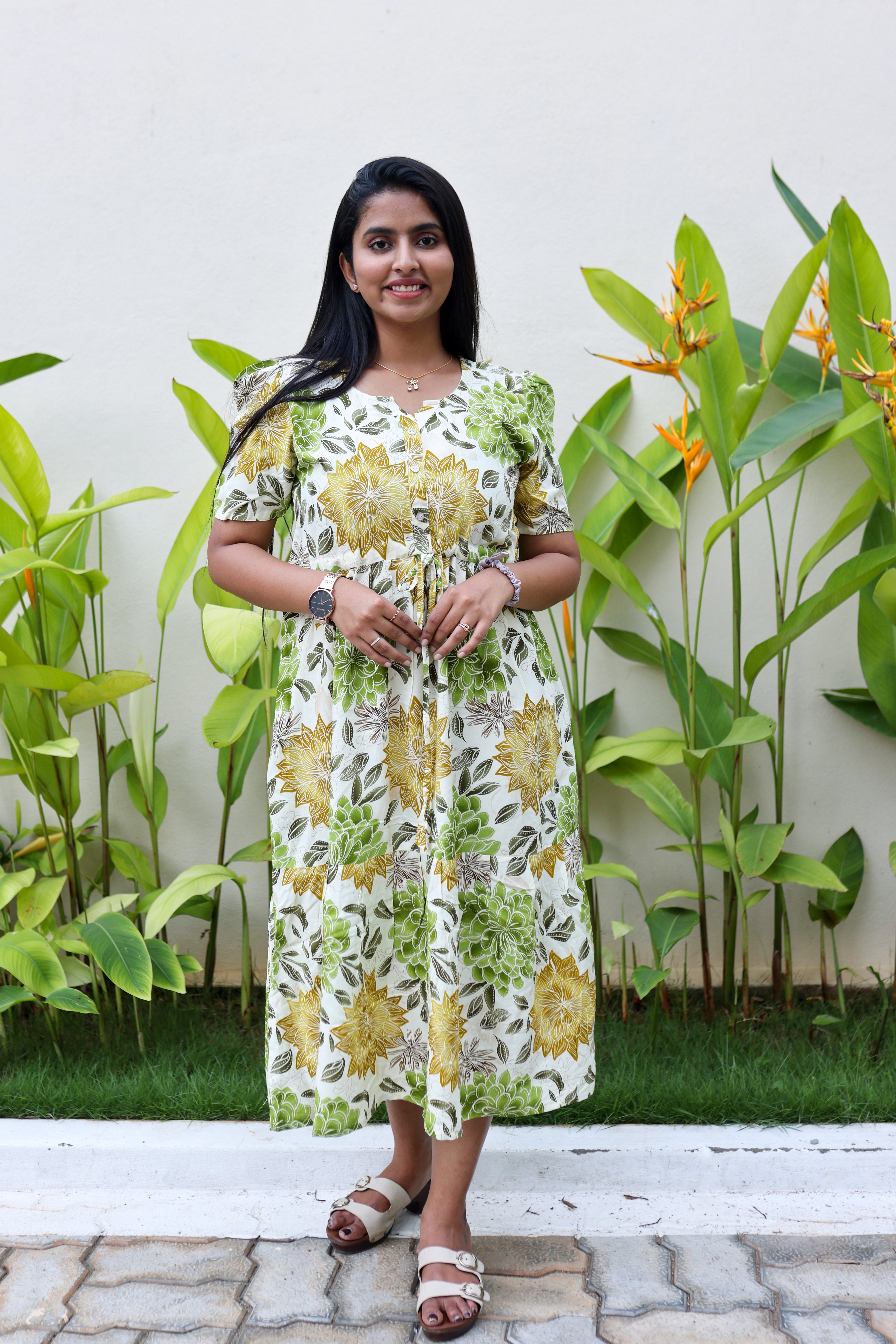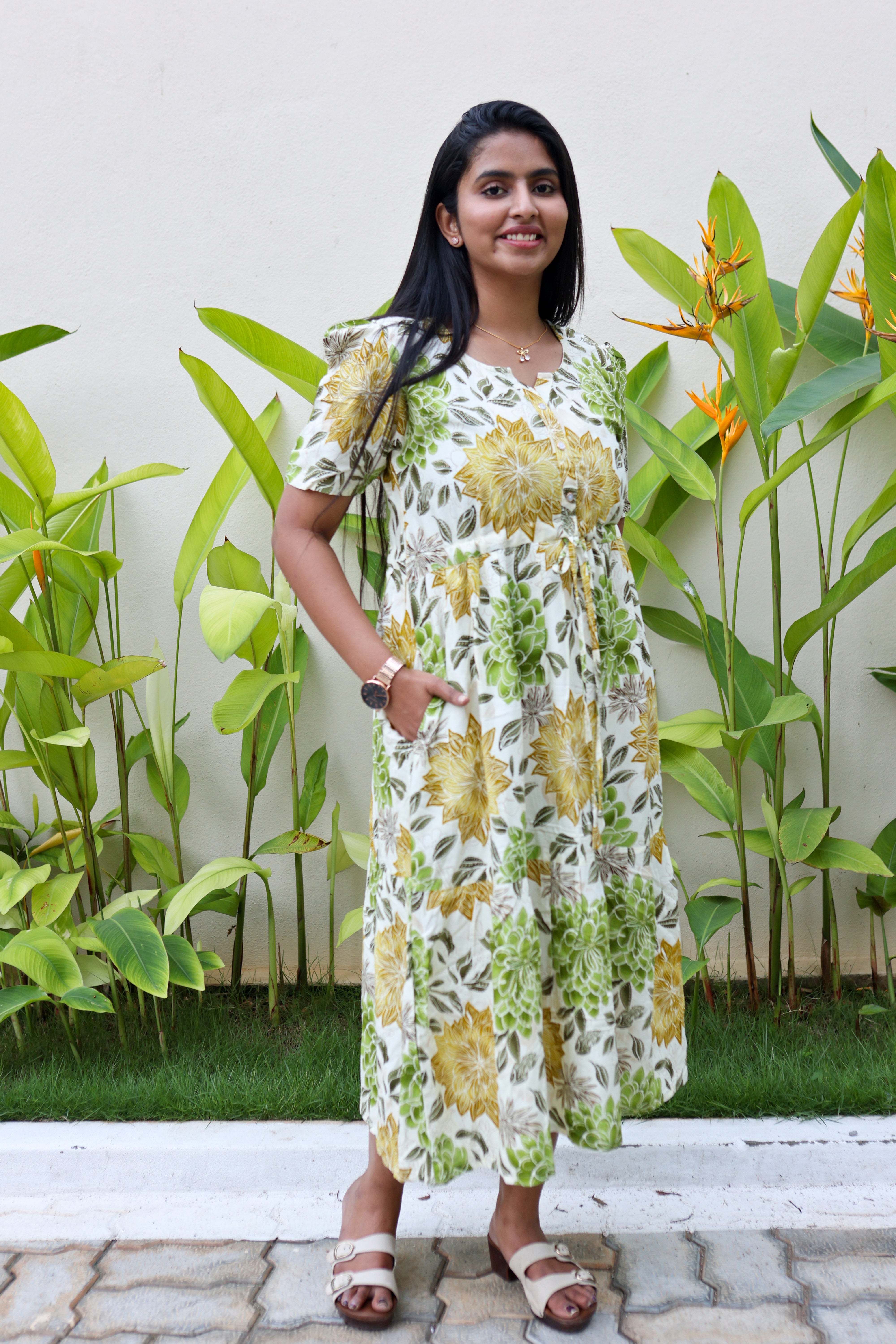 Rayon Colourful Foil Printing Gathering Frock Model Nighties | Side Pocket and Gathering Front Rope | Fancy Sleeve & Maxi Frock Nightwear for Stylish Women's (FGF)