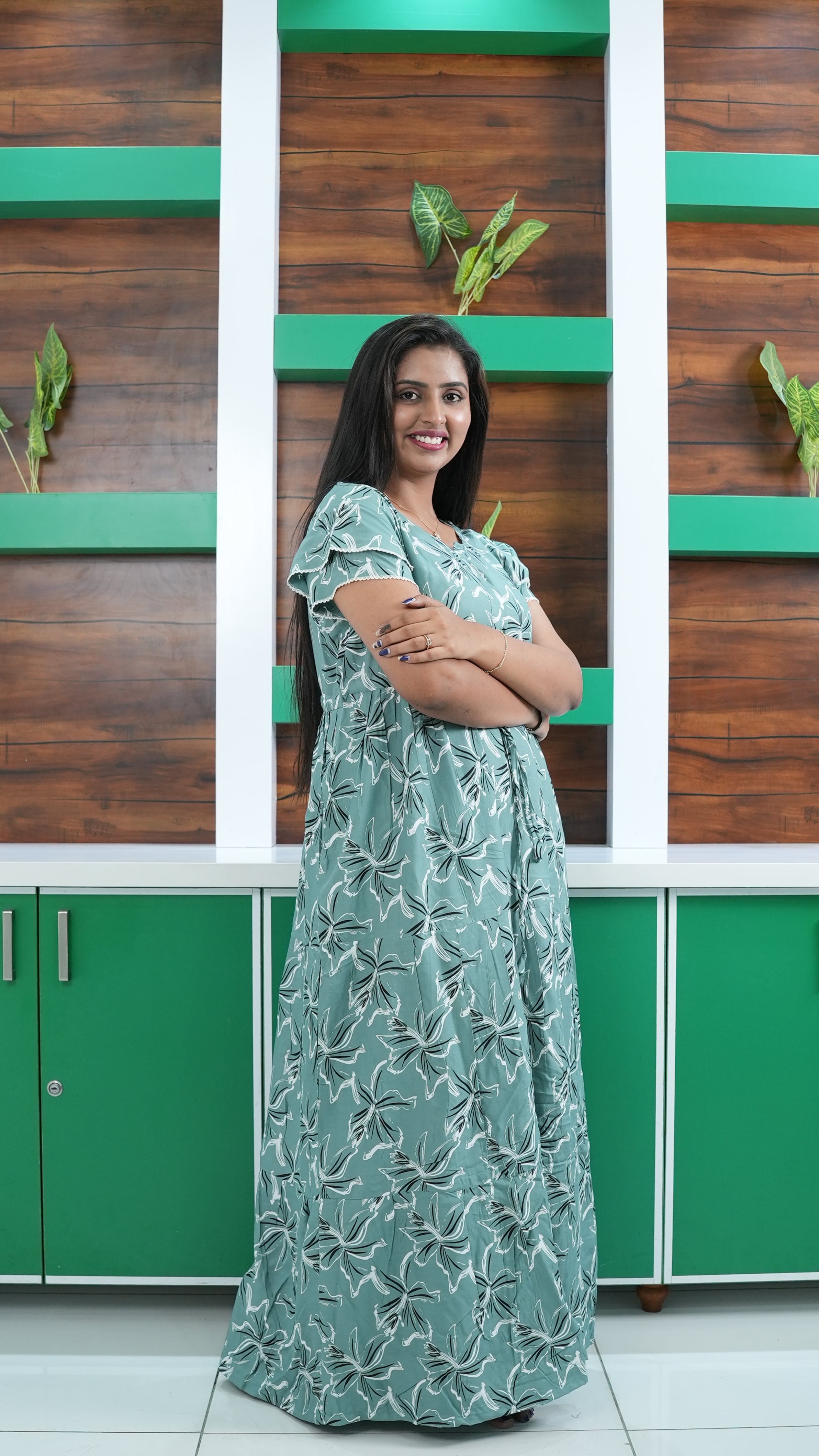Seafoam Green Lily Print Rayon Gathering Frock – Adjustable Front Rope Night Gown with Double Layer Sleeve