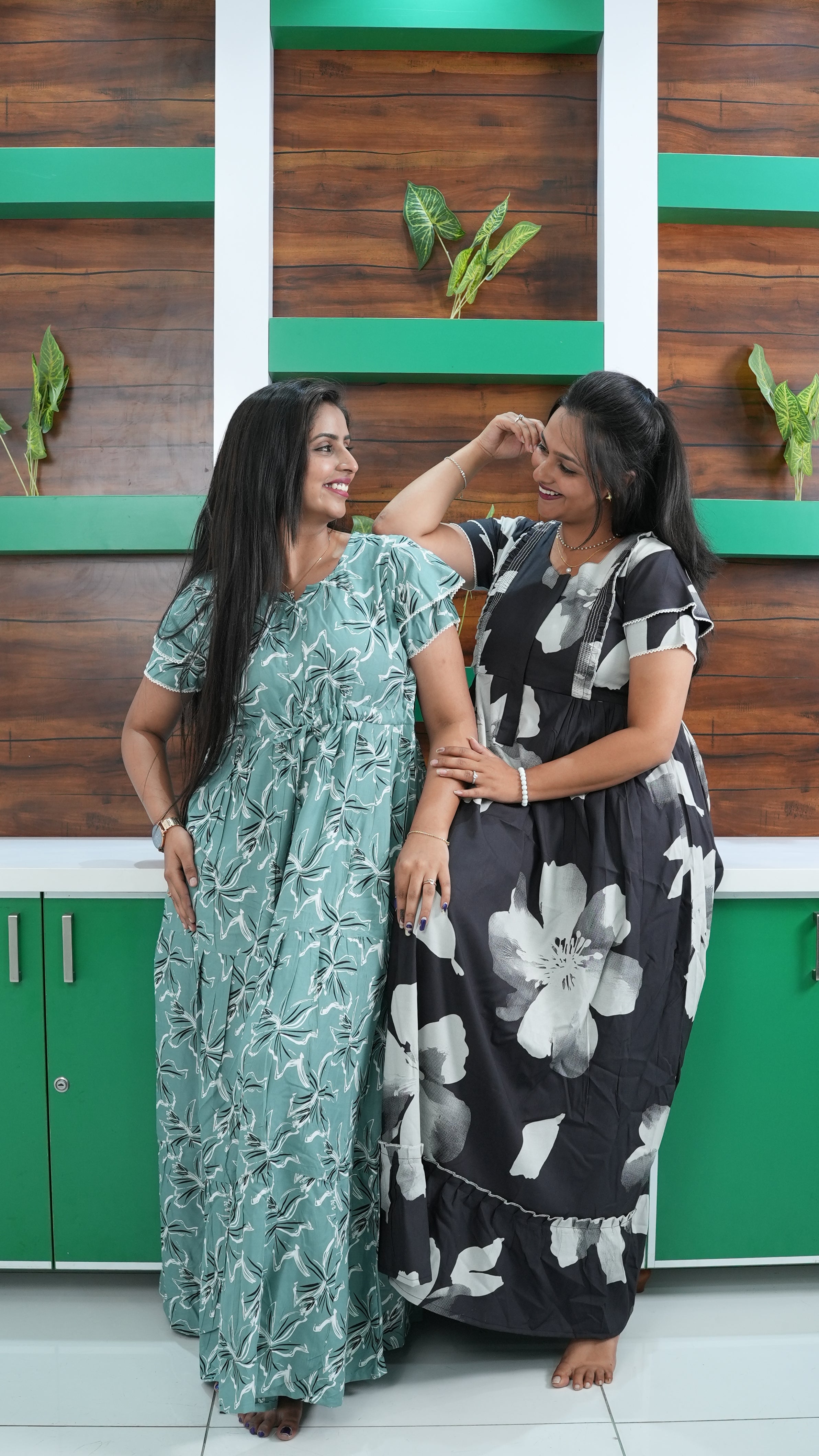 Experience refreshing comfort with our Trending Rayon Gathering Frock. This elegant night gown showcases a graceful Lily Floral pattern in a high-contrast white and black outline, set against a calming Seafoam Green base. Crafted from premium, ultra-soft Rayon, it offers a chic boutique look while providing the lightweight breathability essential for relaxation.