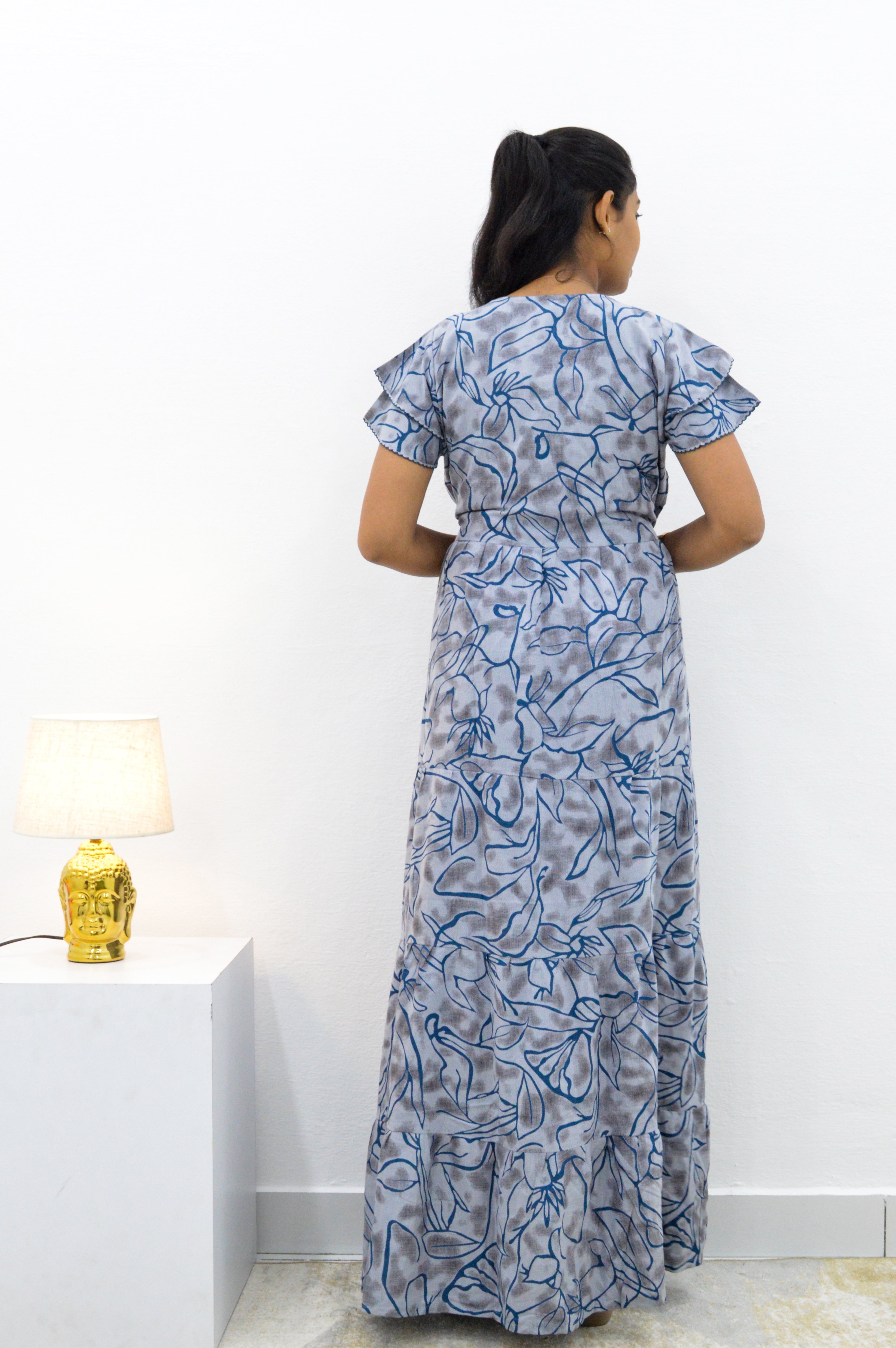 Stylish Arrivals Alpine Gathering Frock Model: This refers to a long, maxi-style nightgown made from Alpine fabric (a soft, usually printed cotton/rayon knit blend) that features a flowy, gathered silhouette like a frock.